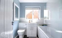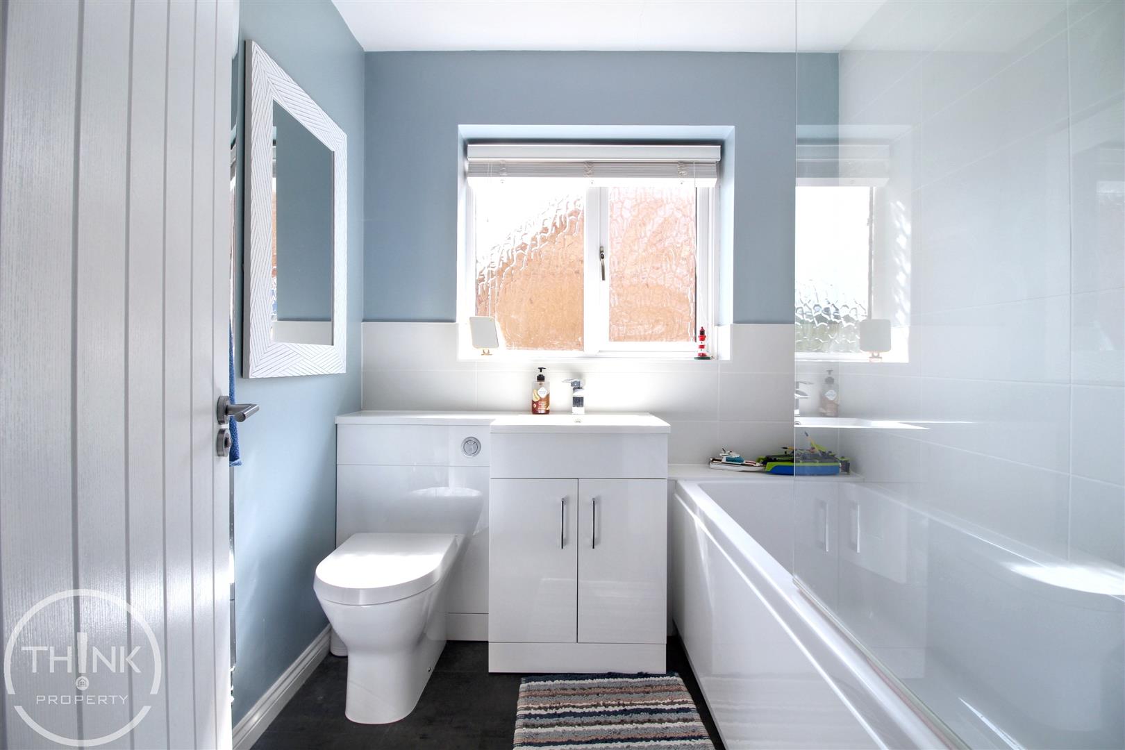 Family Bathroom - Vinyl flooring, low level W/C, vanity sink unit, obscured double glazed window to side, panelled bath with shower, tiled splash backs, heated towel rail, extractor.