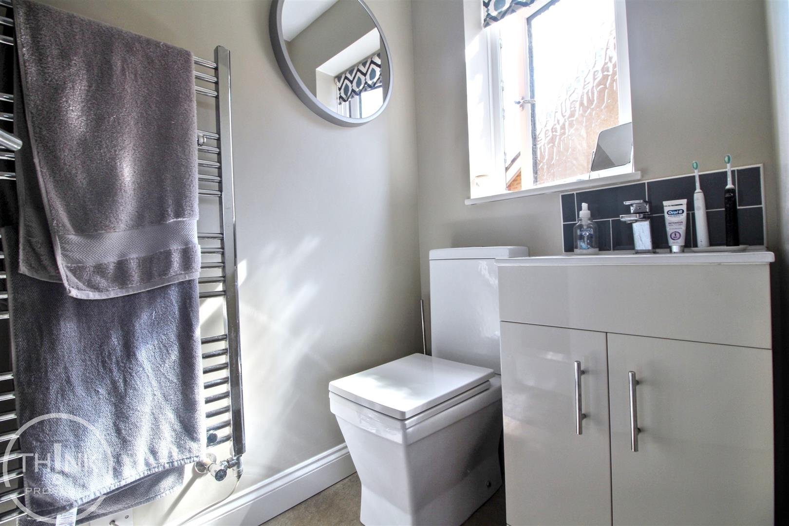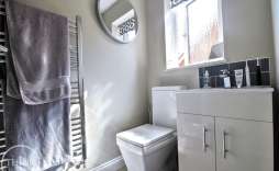 Cloakroom - Vinyl flooring, low level w/c, radiator, obscured double glazed window to front.