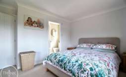 En Suite - Vinyl flooring, low level W/C, vanity sink unit, shower cubicle, heated towel rails, obscured double glazed window to side, extractor.