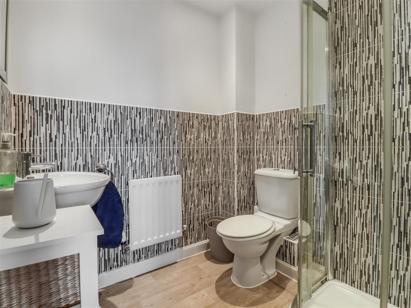 Ensuite - Corner shower cubicle, wc and wash hand basin, radiator and splash backs.