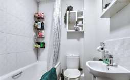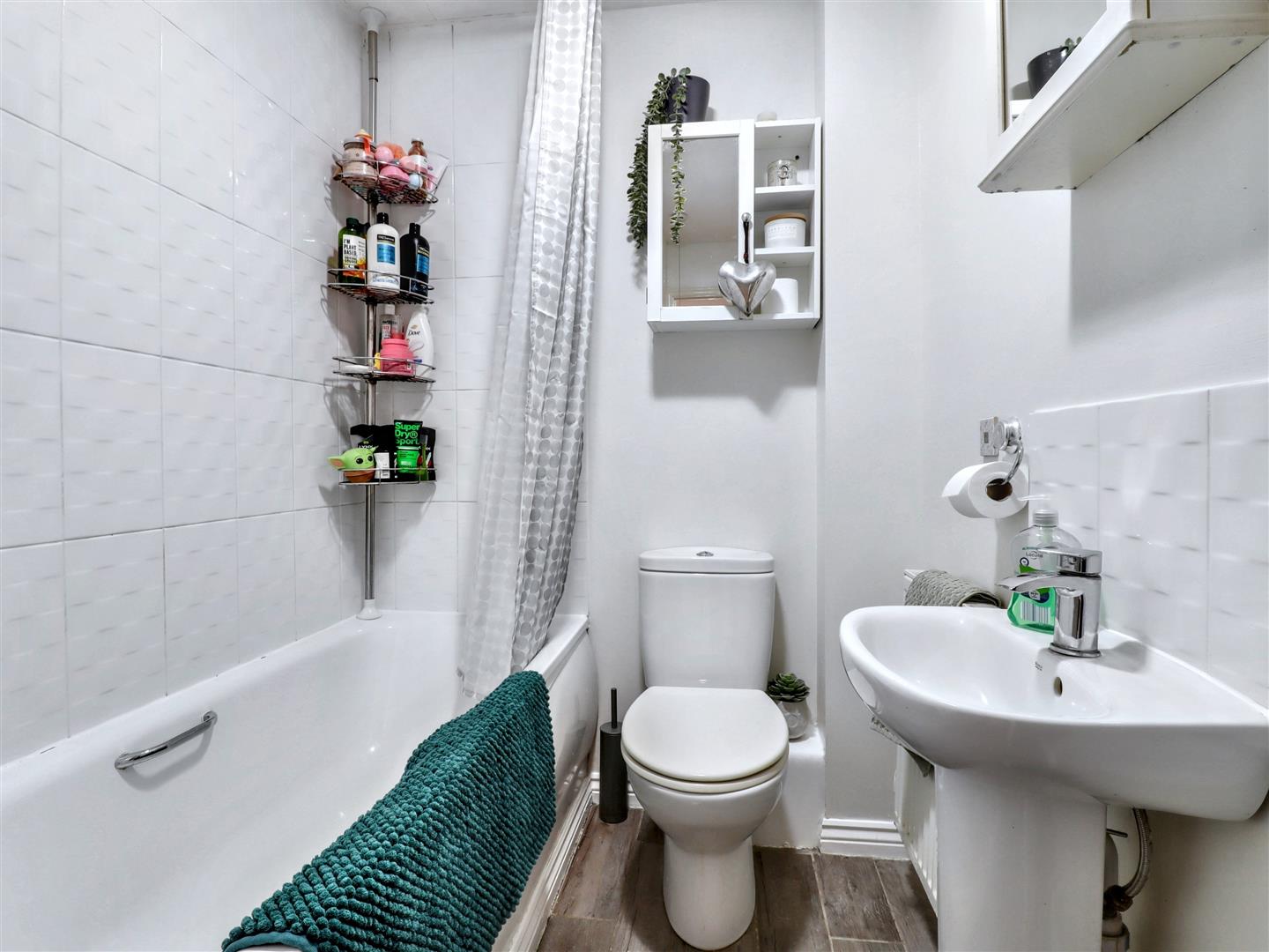 Bathroom - WC, shower over panel bath, washing basin, tiled flooring, radiator, extractor fan and splash backs.