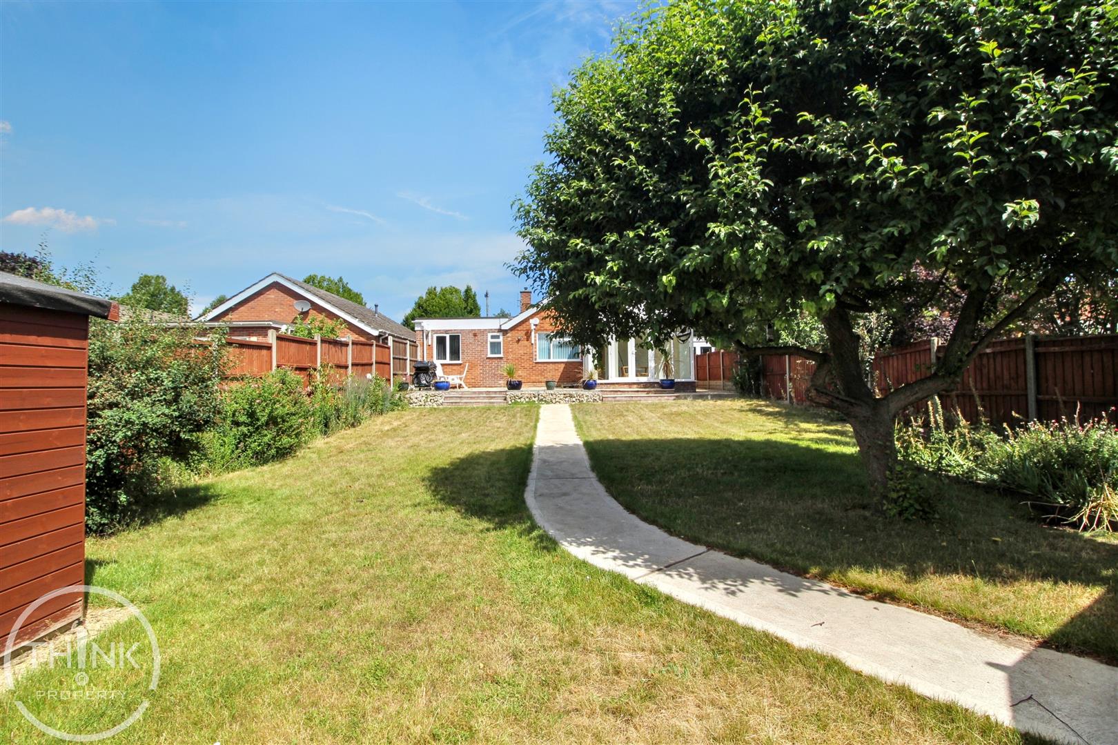 Mainly laid to lawn with paved seating terrace, timber framed summer house, x2 timber framed storage shed, timber fencing, gated access to the side, range of mature, plants, trees and shrubs
