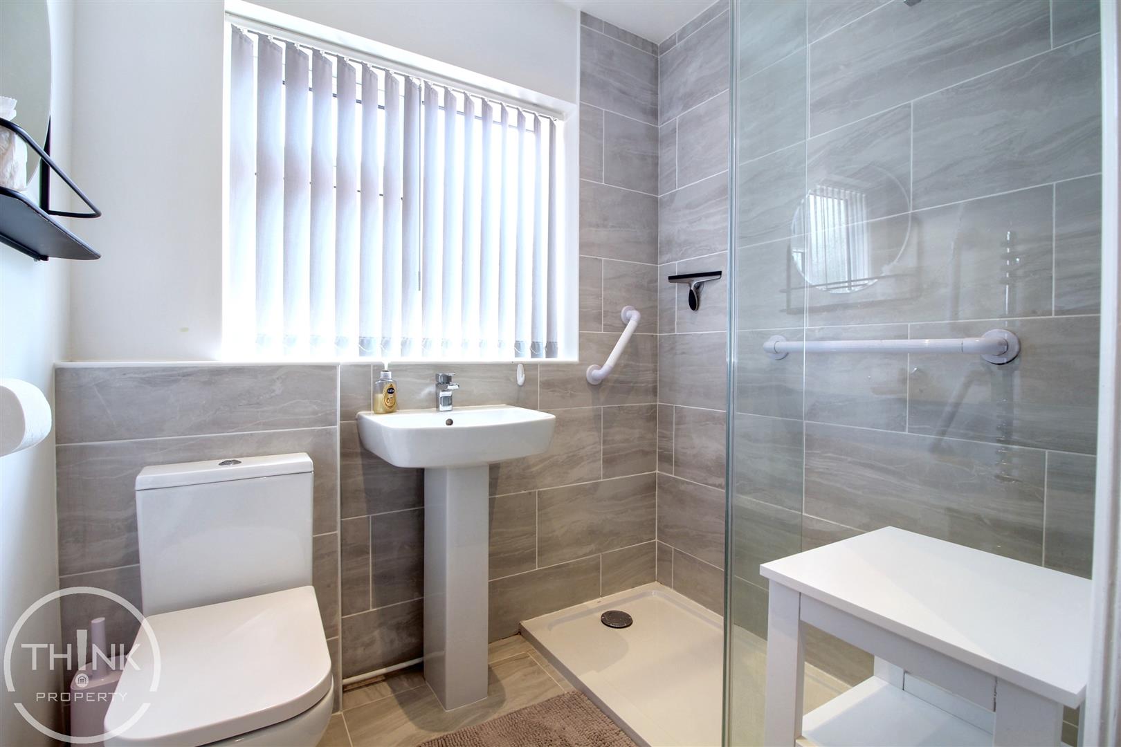 Shower Room - 1.93 x 1.63 (6'3" x 5'4") - Tiled flooring, tiled walls, shower cubicle with rain drop effect shower, pedestal wash basin, low level W.C, obscured double glazed window to side, heated towel rail, spotlights.