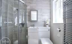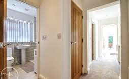 En Suite - Tiled flooring, part tiled walls, shower cubicle, vanity sink unit with storage, low level W.C, heated towel rail, obscured double glazed window to rear, spotlights.