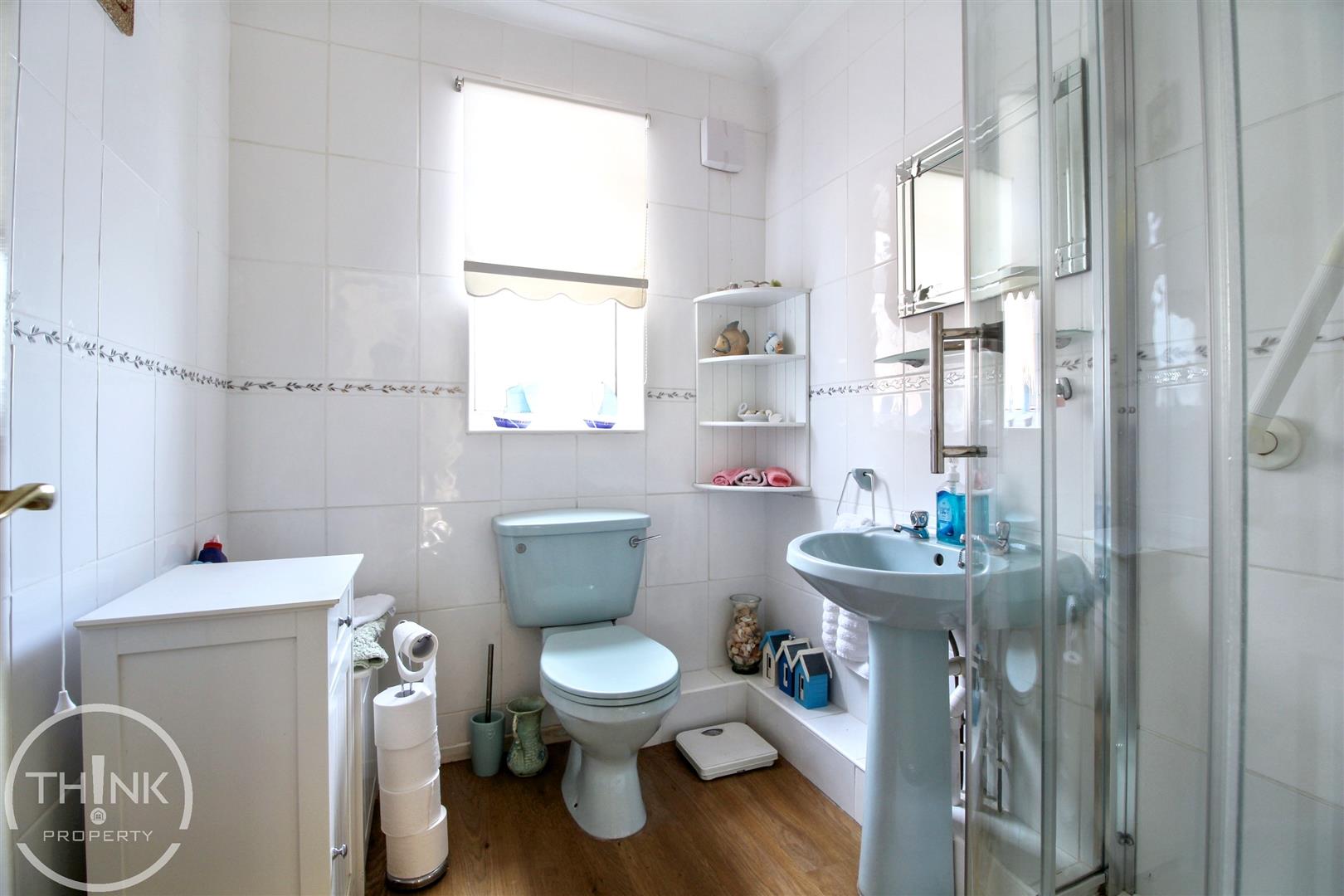Shower Room - Laminate wood flooring, low level W/C, pedestal wash basin, shower cubicle with electric shower, tiled walls, heated towel rail, obscured double glazed window to side.