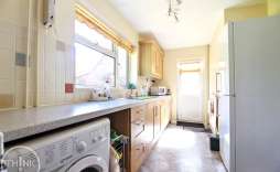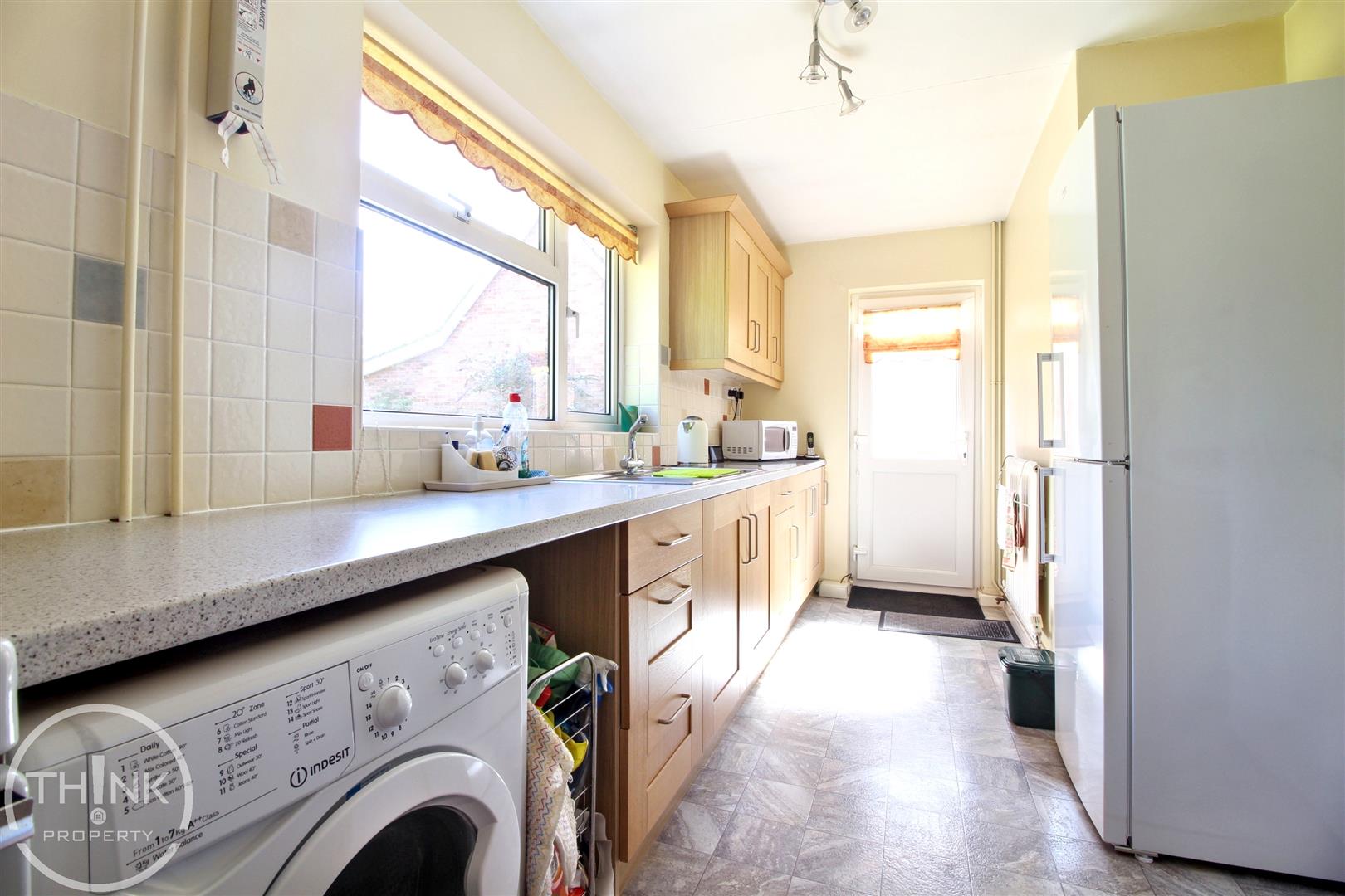 Kitchen - 4.74 x 2.25 (15'6" x 7'4") - Range of fitted base and wall units with work surfaces over, space for free standing cooker, plumbing and space for washing machine, space for fridge freezer, double glazed window to rear, door to side.