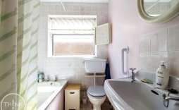 Bathroom - Panelled bath, low level W/C, wall mounted wash basin, tiled splash backs, obscured double glazed window to side.