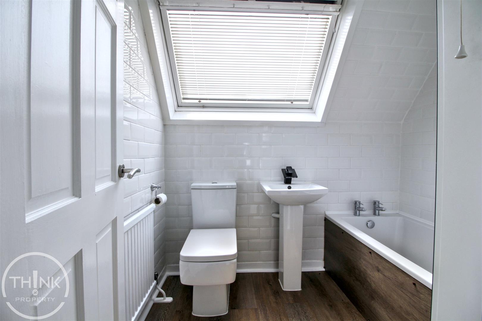Bathroom - Laminate wood flooring, low level w/c, pedestal wash basin, panelled bath, tiled walls, radiator, velux window to rear.