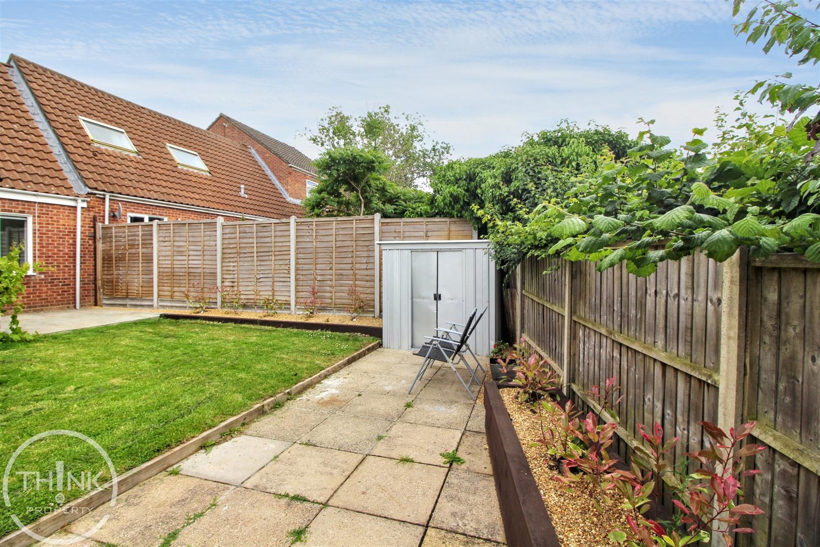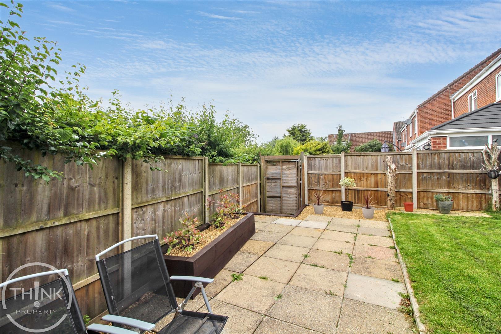 The south facing rear garden offers a peaceful retreat, primarily laid to lawn with a paved seating terrace, ideal for enjoying sunny afternoons. Railway sleeper flower beds add a touch of character, and gated access to the rear provides added convenience.