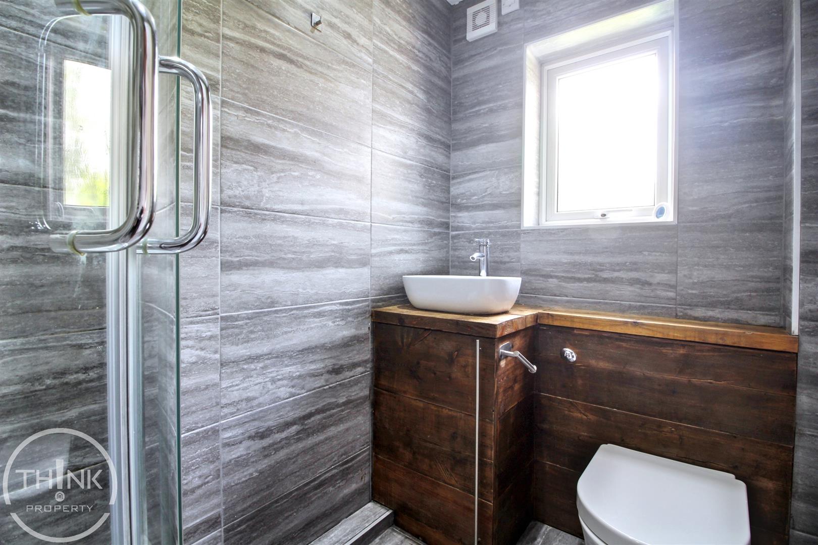 Shower room - Tiled flooring, tiled walls, heated towel rail, shower cubicle with electric shower, low level w/c, vanity sink unit, obscured double glazed window to front, spotlights, extractor.