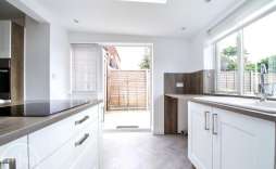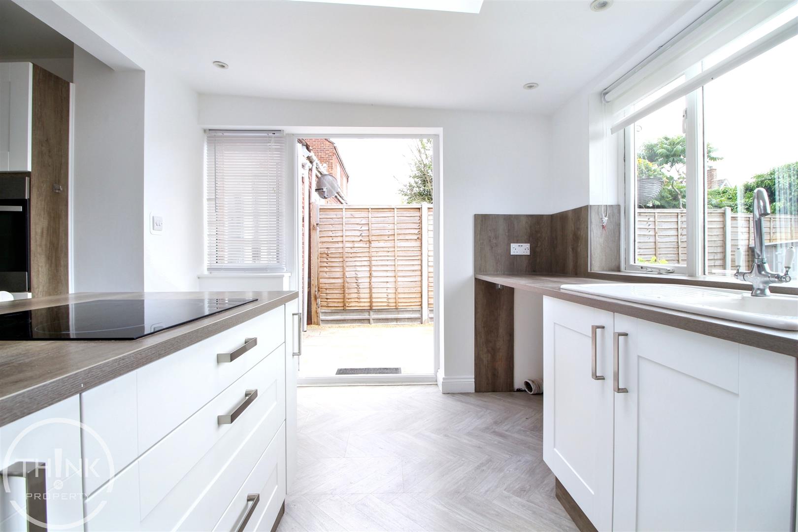 Kitchen/dining room - 5.70 x 3.31 max (18'8" x 10'10" max) - Herringbone flooring, range of fitted base and wall units with work surfaces over, sink drainer unit, kitchen island with integrated electric hob and storage, integrated oven and dishwasher, plumbing and space for washing machine, space for tumble dryer, integrated fridge freezer, spotlights, double glazed window to side x2, double glazed window to rear, doors to garden, velux window.