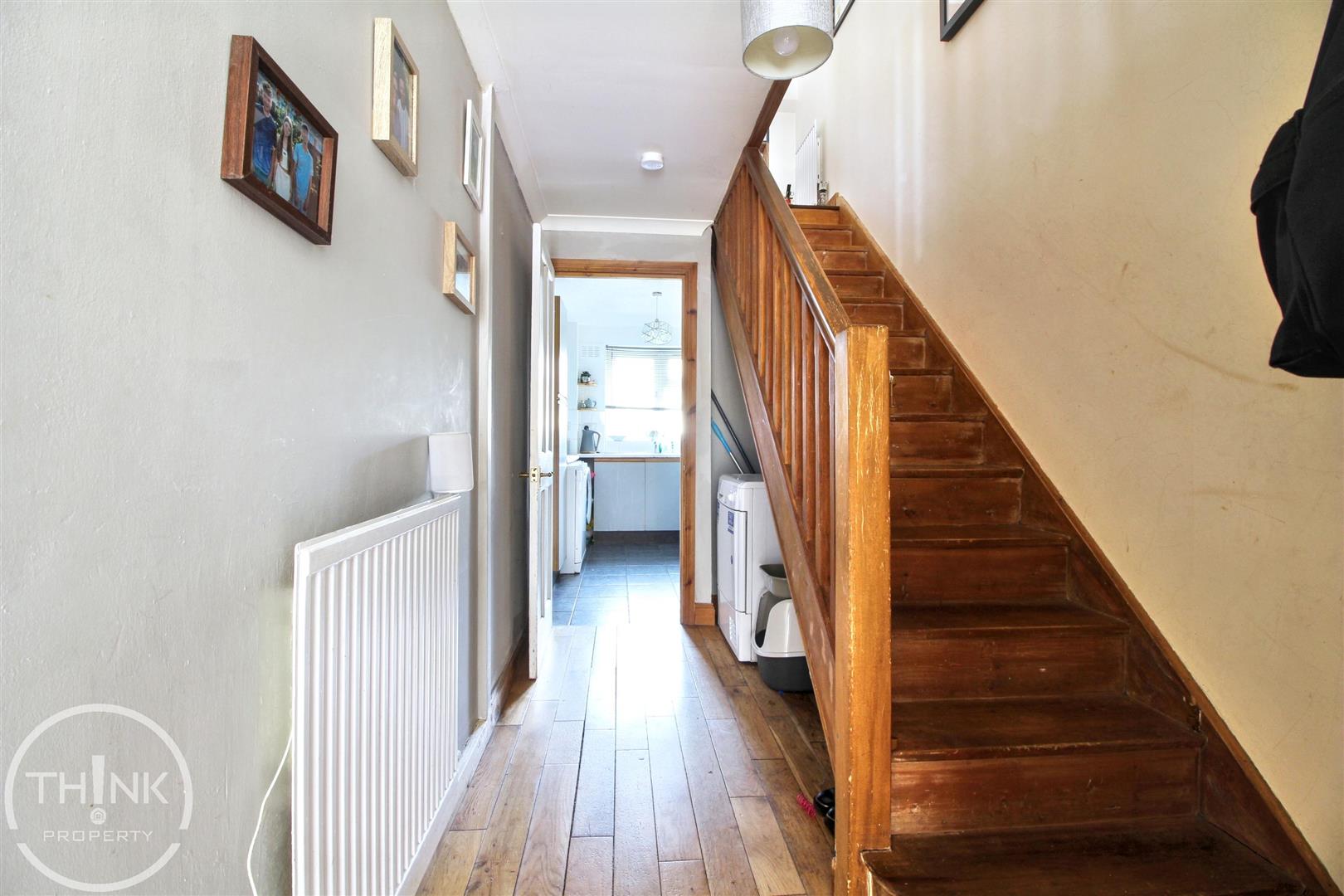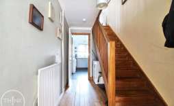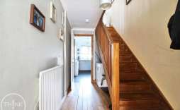 Hallway - Wood flooring, stairs to first floor, radiator, storage room, door to cloakroom, sliding doors to garden.