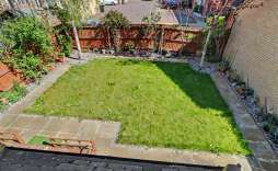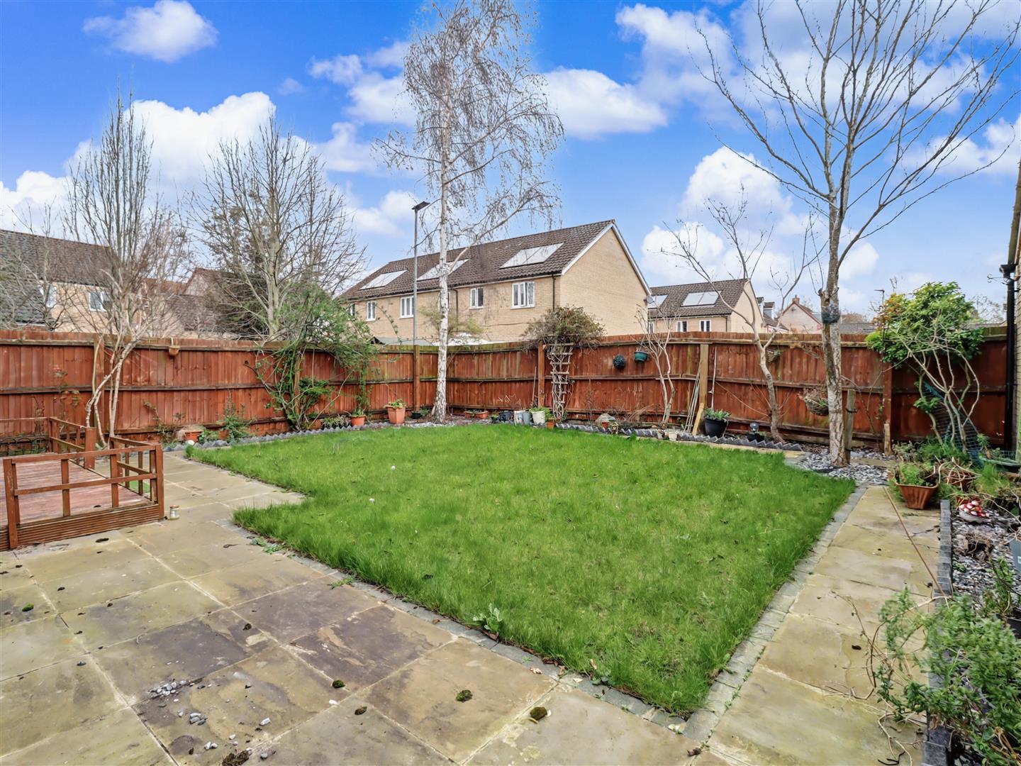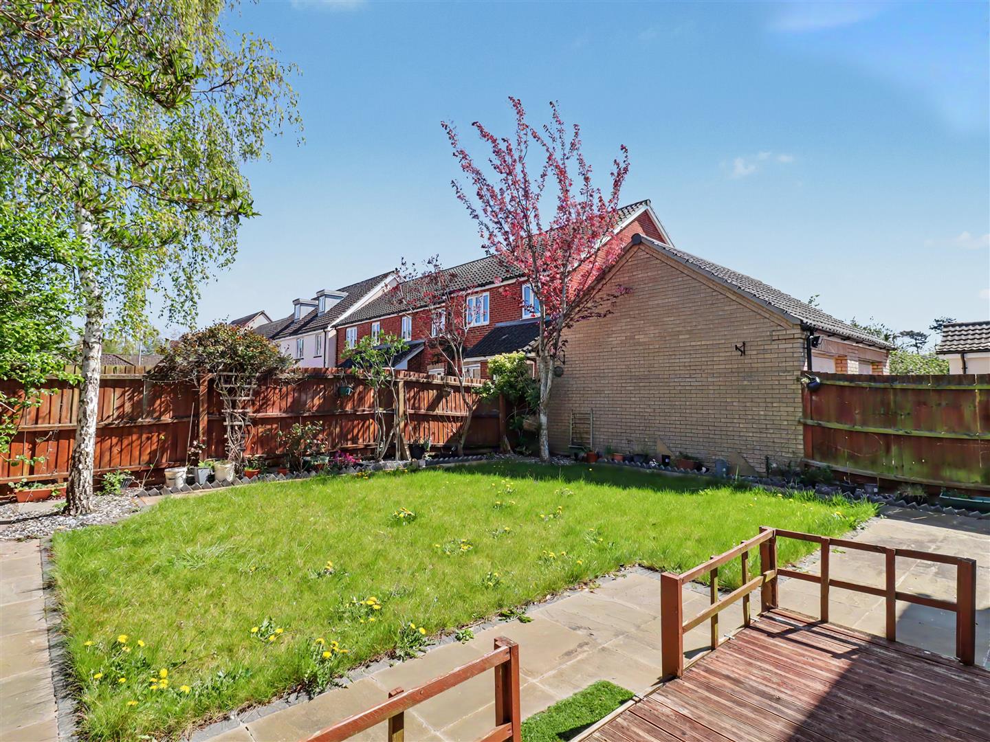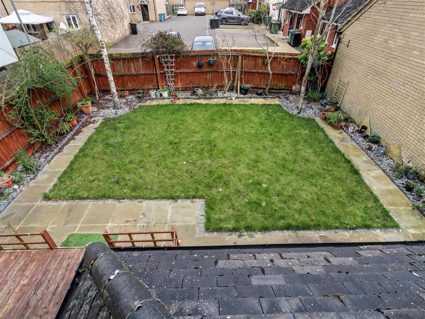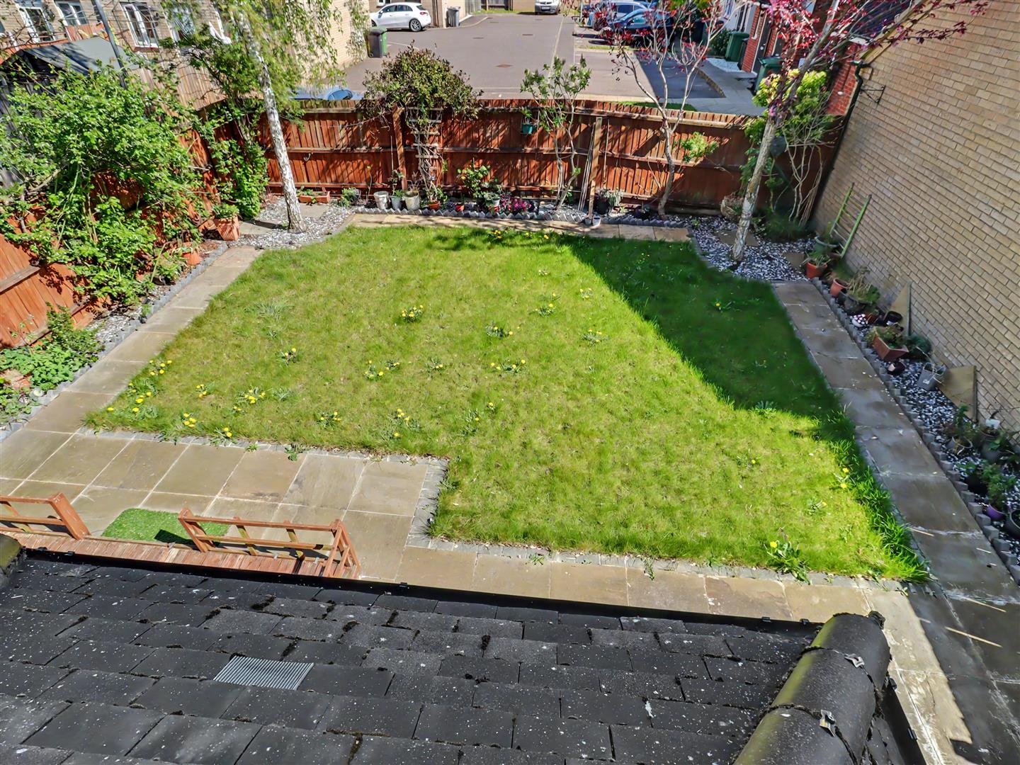 The rear garden is a delightful retreat, featuring a well-maintained lawn bordered by established flowers and shrubs. A patio area provides an ideal spot for outdoor dining or simply enjoying the tranquil surroundings. The garden also benefits from backing onto a small residential parking area, ensuring privacy and a peaceful environment.