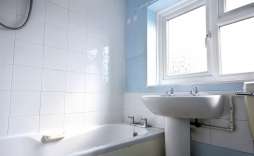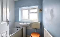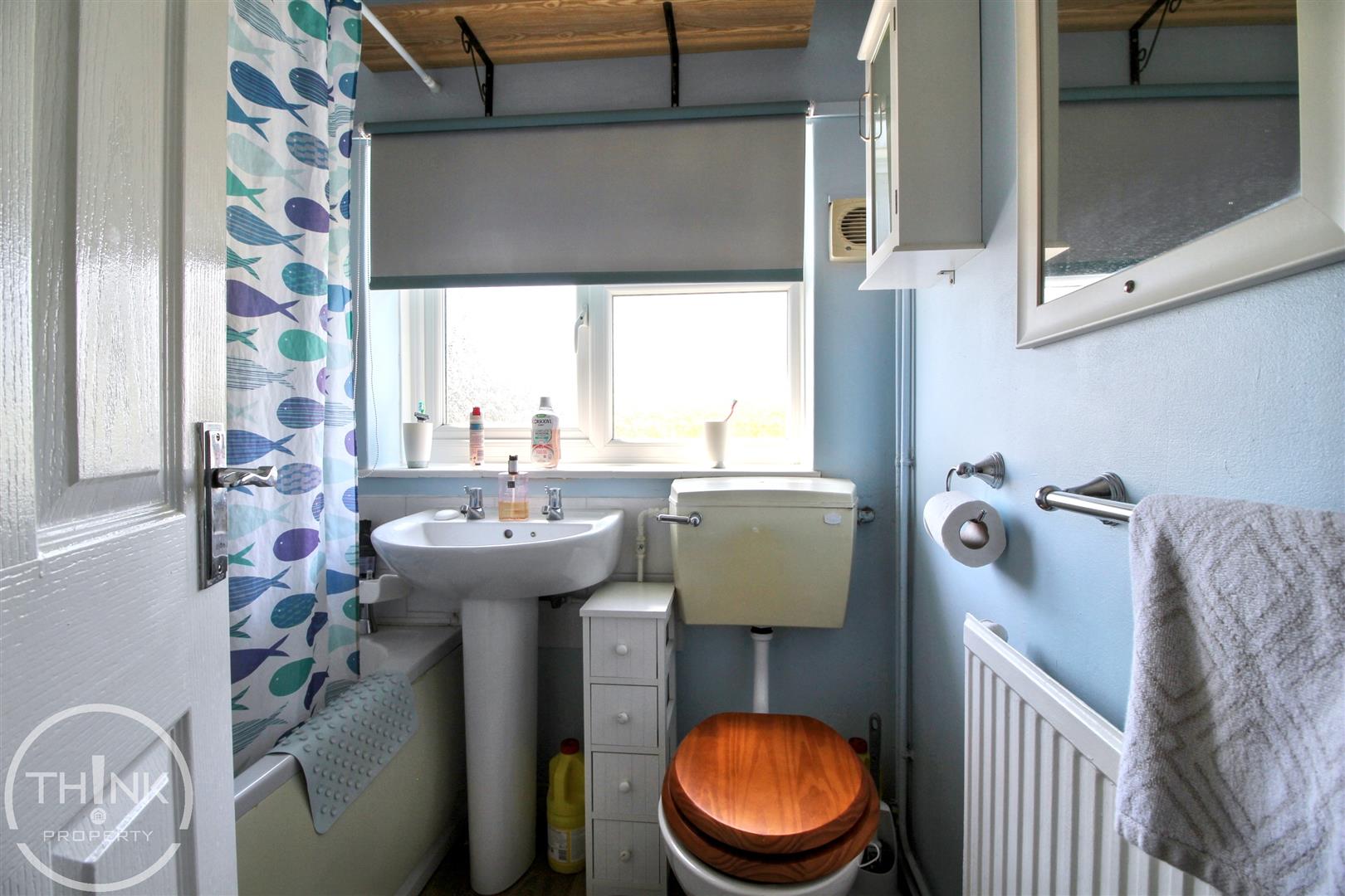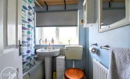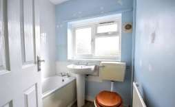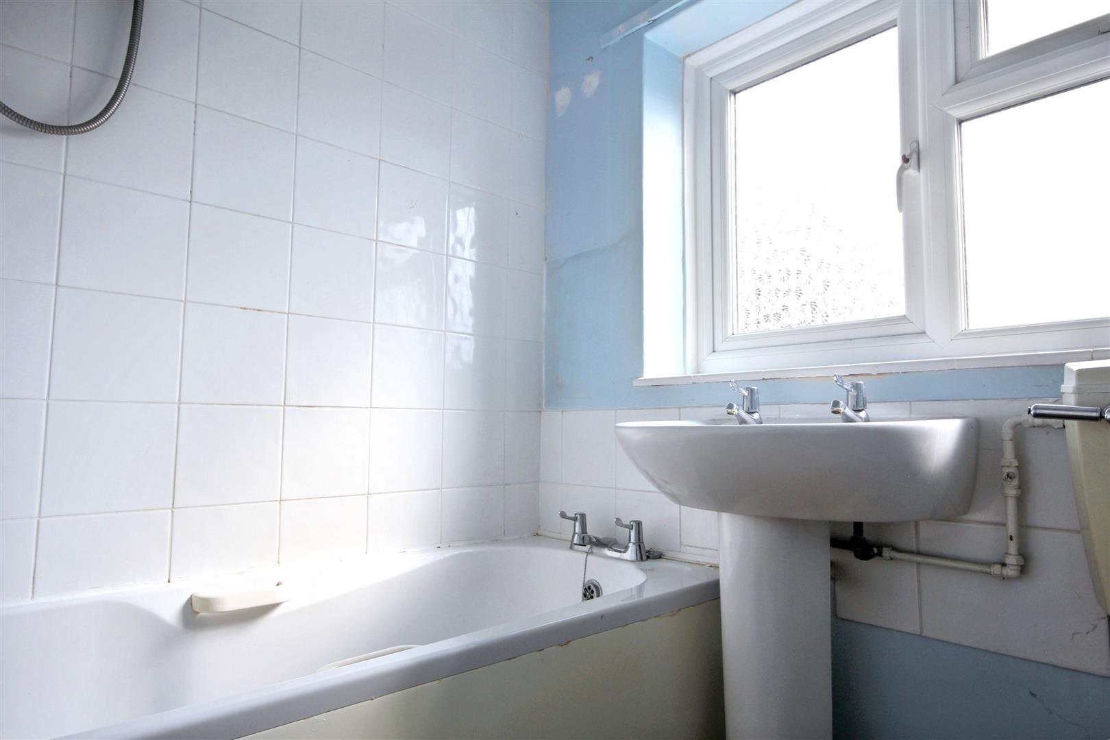 Bathroom - Laminate wood flooring, low level W/C, pedestal wash basin, panelled bath with electric shower, radiator, extractor, obscured double glazed window to rear.
