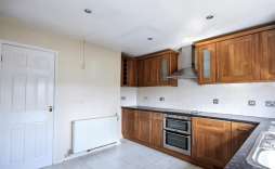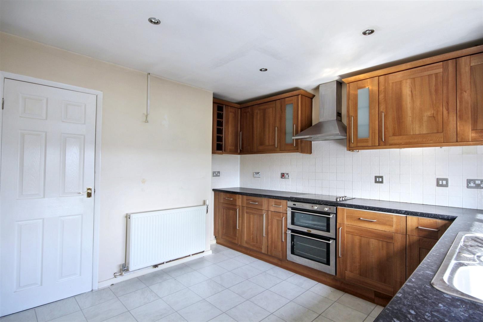 Kitchen/Dining Room - 3.45 x 3.24 (11'3" x 10'7") - Range of fitted base and wall units with roll edge work surfaces over, integrated oven, hob and hood, tiled splash backs, space for free standing fridge freezer, plumbing and space for washing machine, storage cupboard, double glazed window to rear, spotlights.