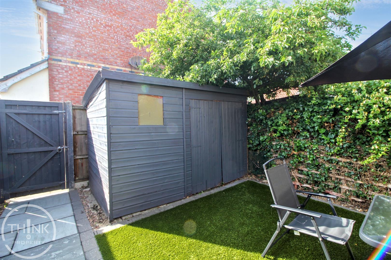Outside - To the rear is a stunning landscaped rear garden with Indian sandstone patio and walkway and artificial grass lawn, timber framed storage shed and timber fencing.