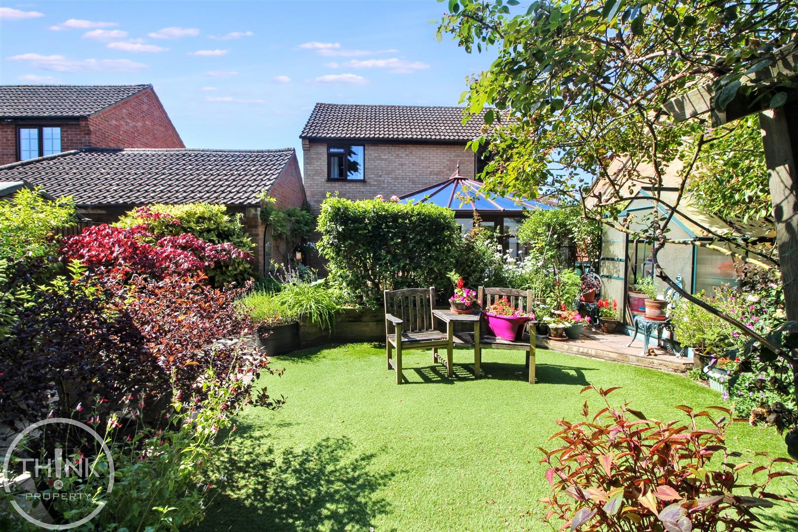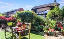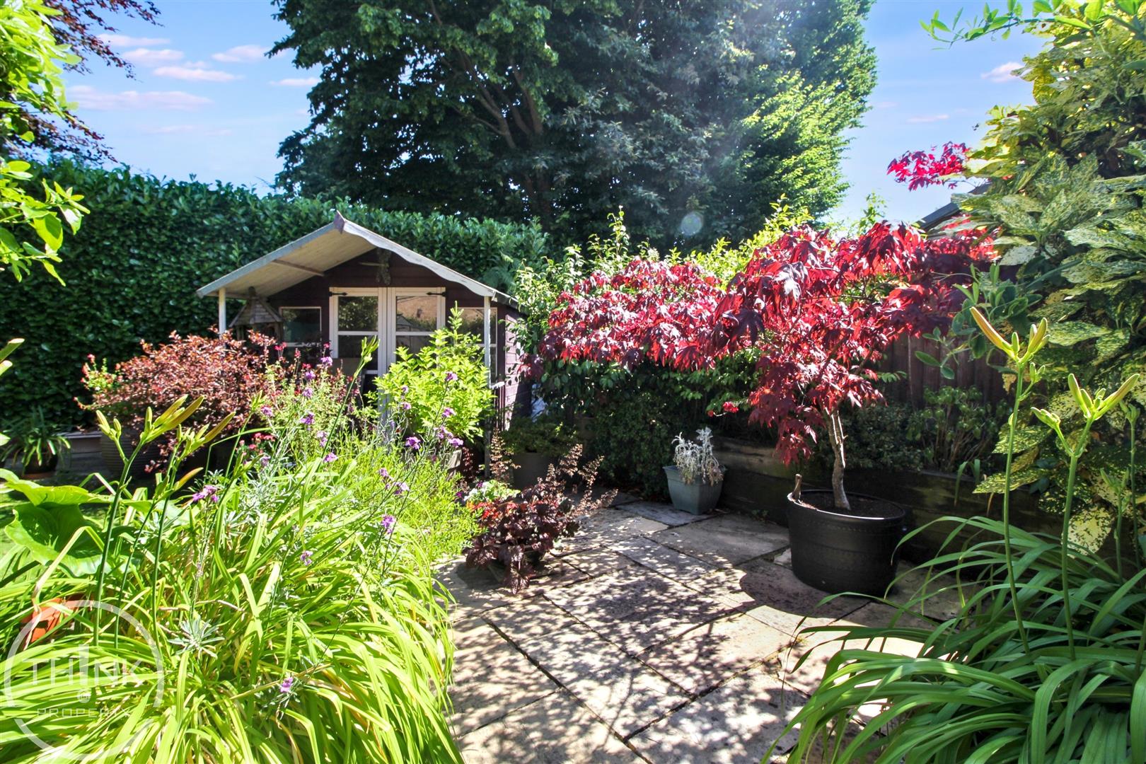 Outside - Driveway to garage, to the rear there is a private enclosed garden with paved seating terrace, artificial grass, timber framed summer house, a range of mature plants, trees and shrubs