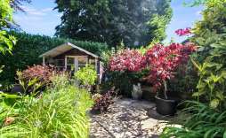 Outside, you will find a driveway with parking for two vehicles, along with a garage for additional storage. The enclosed private rear garden is a true highlight, featuring a range of mature plants, trees, and shrubs that create a tranquil oasis. A charming timber-framed summer house offers a perfect spot for relaxation or hobbies.