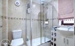 Bathroom - Tiled flooring, low level WC, shower cubicle with rain drop effect shower, vanity sink unit with storage, tiled walls, extractor, heated towel rail, obscure double glazed window to front