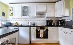 Kitchen - 3.95 max x 2.20 (12'11" max x 7'2") - Laminate wood flooring, range of fitted base and wall units with work surfaces over, tiled splash backs, plumbing and space for washing machine, space for under counter fridge, space for free standing fridge freezer, integrated oven, hob and extractor, servers hatch, double glazed window to front.