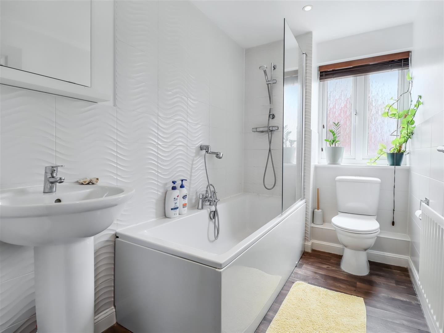 Bathroom - 2.7m x 1.6m - Sealed unit double glazed window to the side aspect with privacy glass, low level WC, pedestal wash hand basin, bath with shower overhead and glass shower screen, radiator, splash-back tiles and wood effect vinyl flooring.