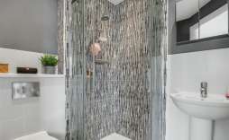 Ensuite - 1.8m x 1.6m - Three piece suite with corner shower, splash back tiles, low level WC, stand alone sink basin, radiator, extractor and wood effect vinyl flooring.