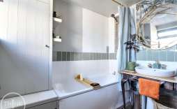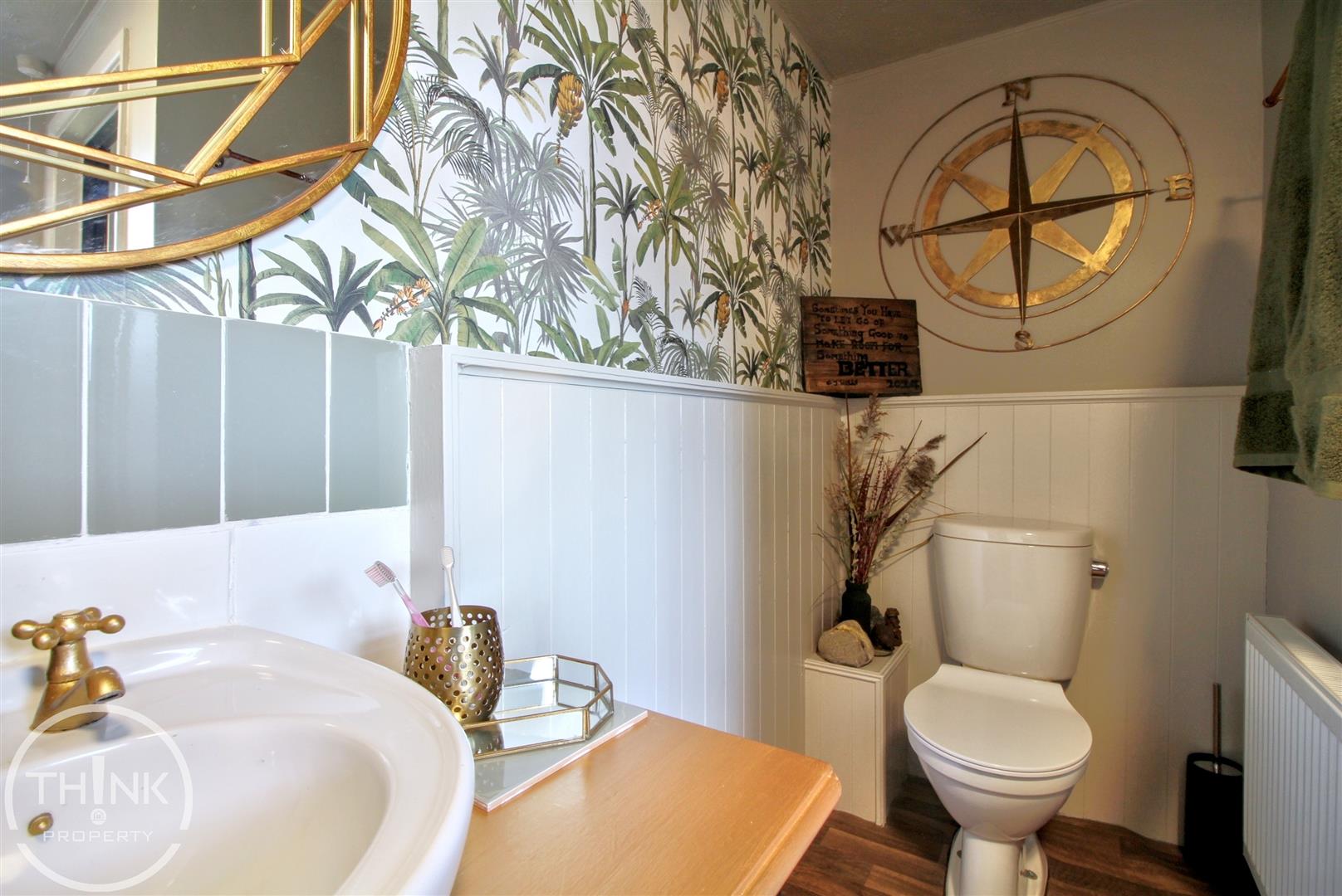 Bathroom - Tiled flooring, low level W/C, pedestal wash basin, panelled bath with shower attachment, tiled splash backs, storage cupboard, obscured double glazed window to rear.