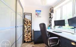 Study - 2.20 x 1.87 (7'2" x 6'1") - Laminate wood flooring, sliding door storage cupboards, fitted office furniture, double glazed window to front.