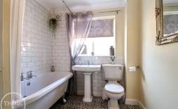 Bathroom - 2.46 max x 2.19 (8'0" max x 7'2") - Tiled floor, low level W/C, pedestal wash basin, roll top claw foot bath with raindrop effect shower, radiator, obscured double glazed window to side.