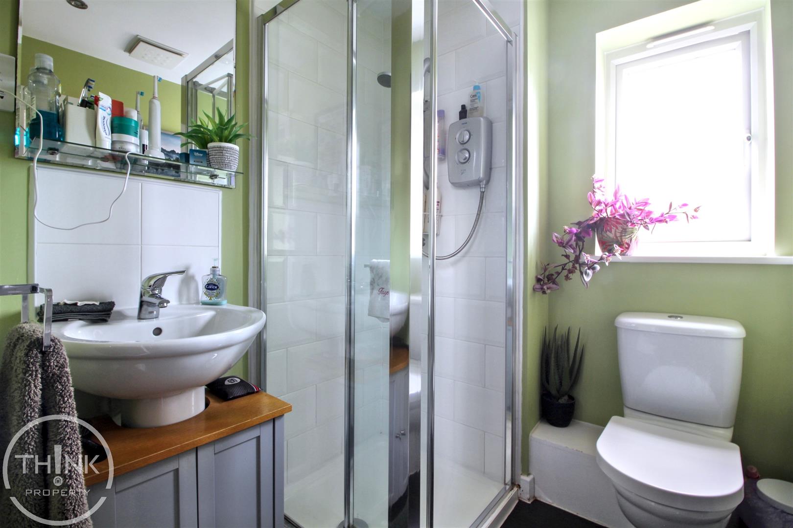 En Suite - Tiled flooring, shower cubicle, pedestal wash basin, low level W/C, heated towel rail, obscured double glazed window to side, extractor.