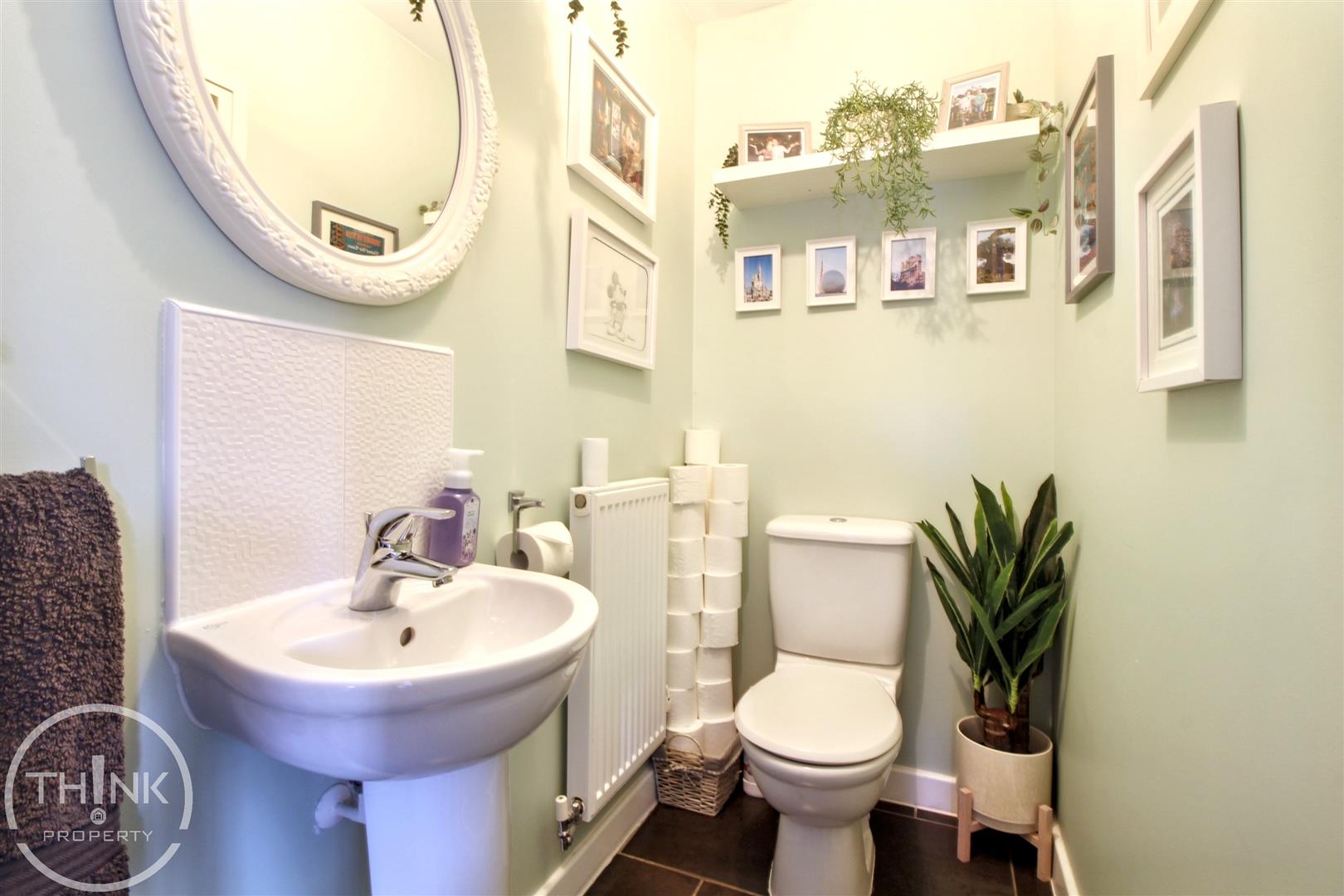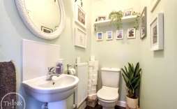 Cloakroom - Tiled flooring, pedestal wash basin, low level W/C, radiator, tiled splash backs, radiator, extractor.