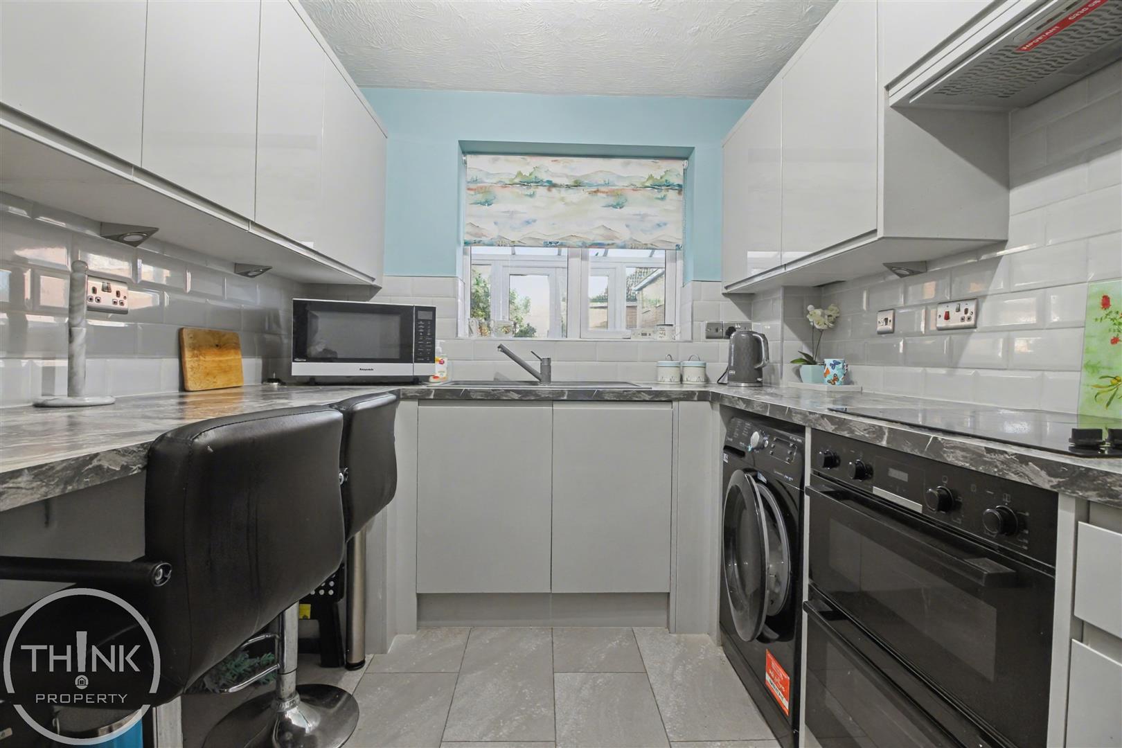Kitchen - 3.09 x 2.34 (10'1" x 7'8") - Range of fitted base and wall units with work surfaces over, integrated oven, hob and extractor, plumbing and space for washing machine, integrated fridge, breakfast bar, double glazed window to rear.
