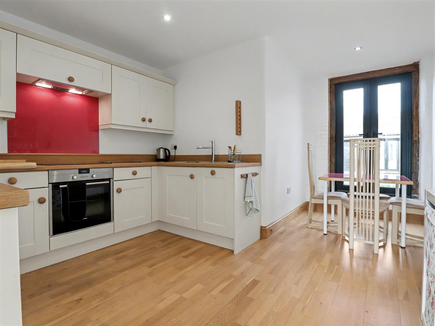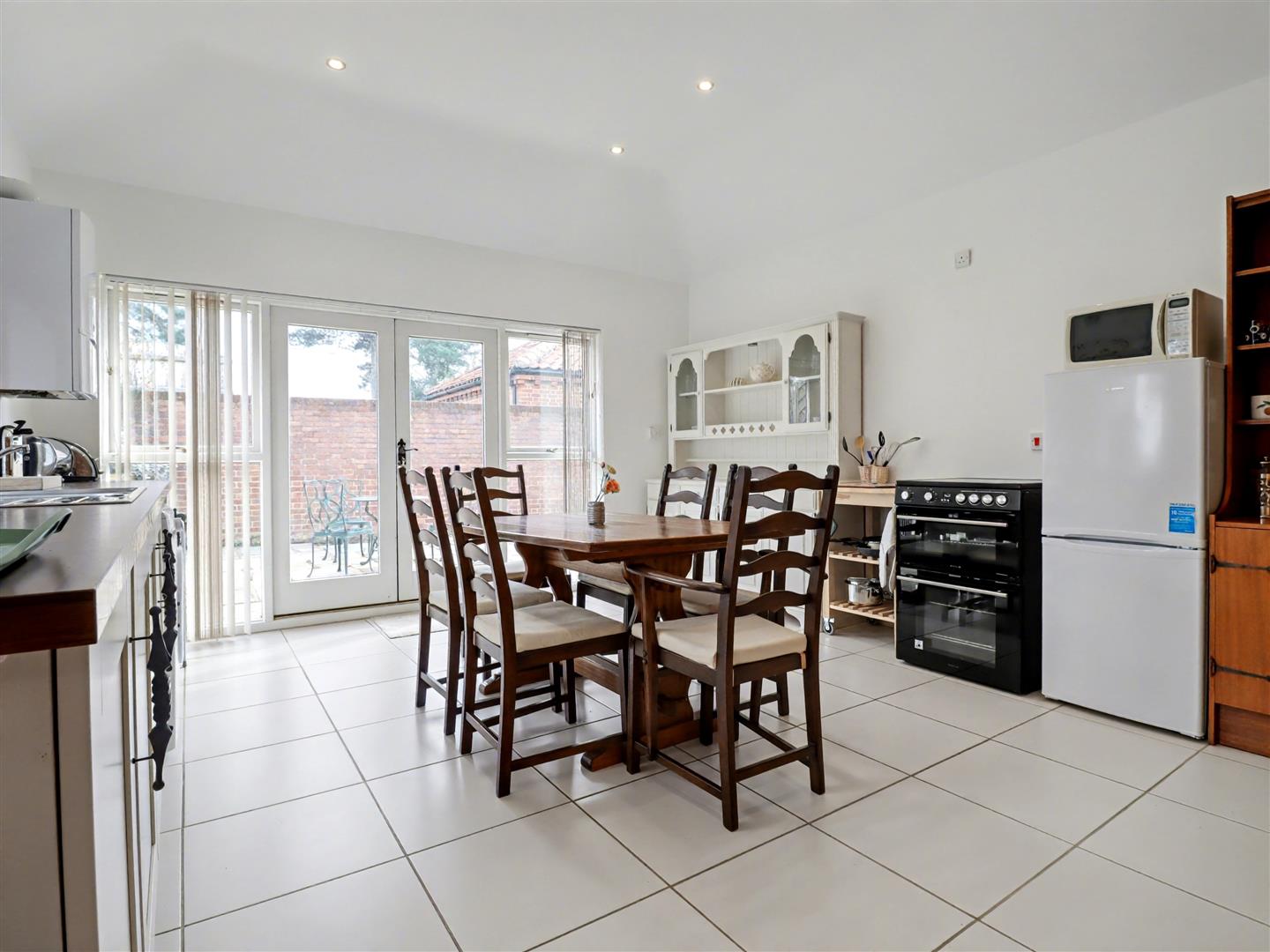 Bedroom Four - 4.93m max x 3.63m max (16'2 max x 11'11 max) - Currently converted into an additional kitchen, this room can easily be restored to its original use as a bedroom. Sealed unit double-glazed double doors open to the side, and a radiator provides comfortable heating