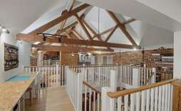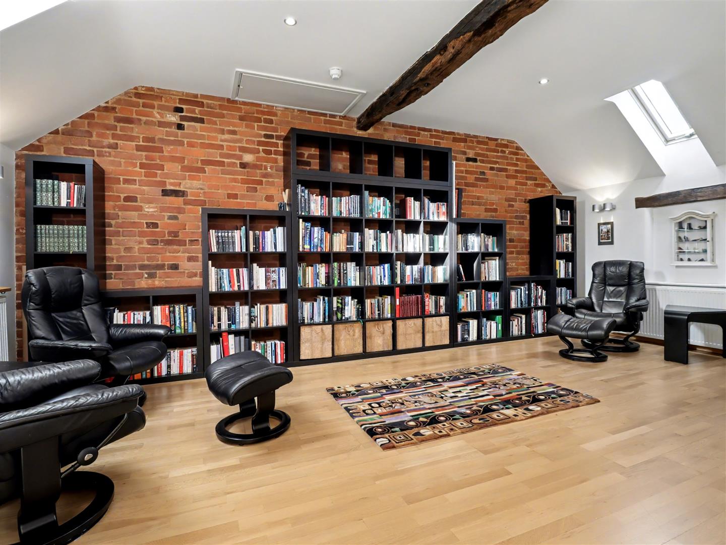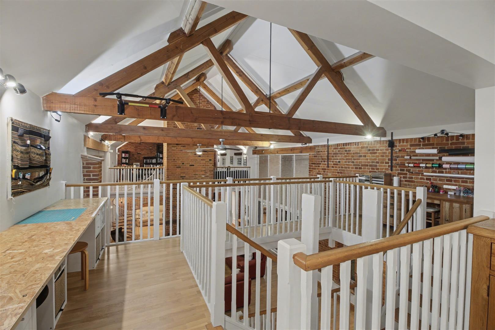 Mezzanine Library/Study - 6.12m x 5.72m (20'1 x 18'9) - This stunning library/study is a truly inspiring space, filled with natural light from three Velux roof windows. A balcony overlooks the opposite landing and offers a striking view down into the drawing room, creating a sense of openness and connection while providing the perfect atmosphere for reading, working, or relaxing in style.