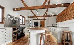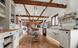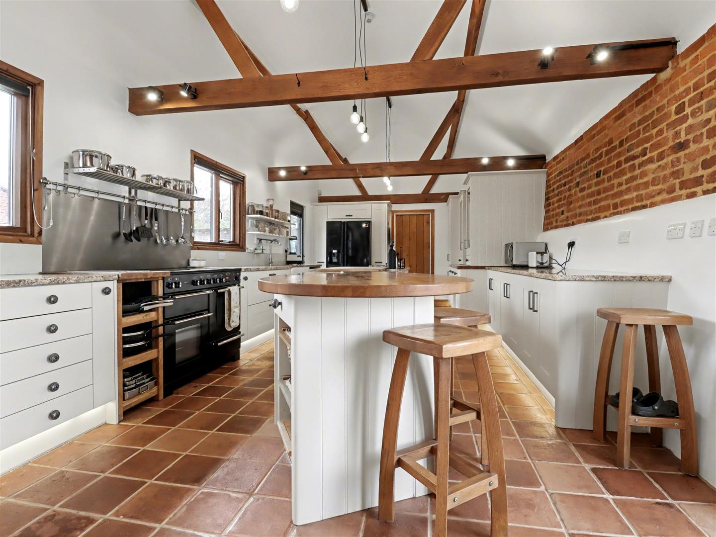 This stunning country kitchen is designed for family living, featuring a full range of base units, including glazed display cabinets with an integrated plate rack. A central island provides an ideal space for meal preparation or a perfect spot for morning coffee. The far side hosts an inset Belfast sink with plumbing and space for a dishwasher. The kitchen also offers an integrated fridge/freezer, space for a range-style cooker, and a built-in coffee machine. Under-cabinet kickboard lighting adds a warm glow, while areas of exposed brickwork complement the pamment-style flooring, giving the room a charming, rustic character.