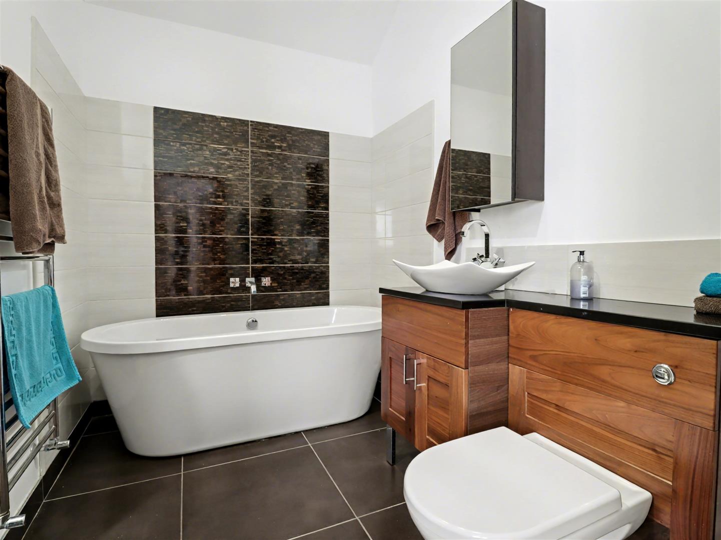 Ensuite Wet Room - The principal bedroom suite is complemented by a stylish wet room, featuring tiled and splash board walls and flooring, a WC, and a wash hand basin. Sleek and contemporary, it provides a luxurious and practical addition to the suite.