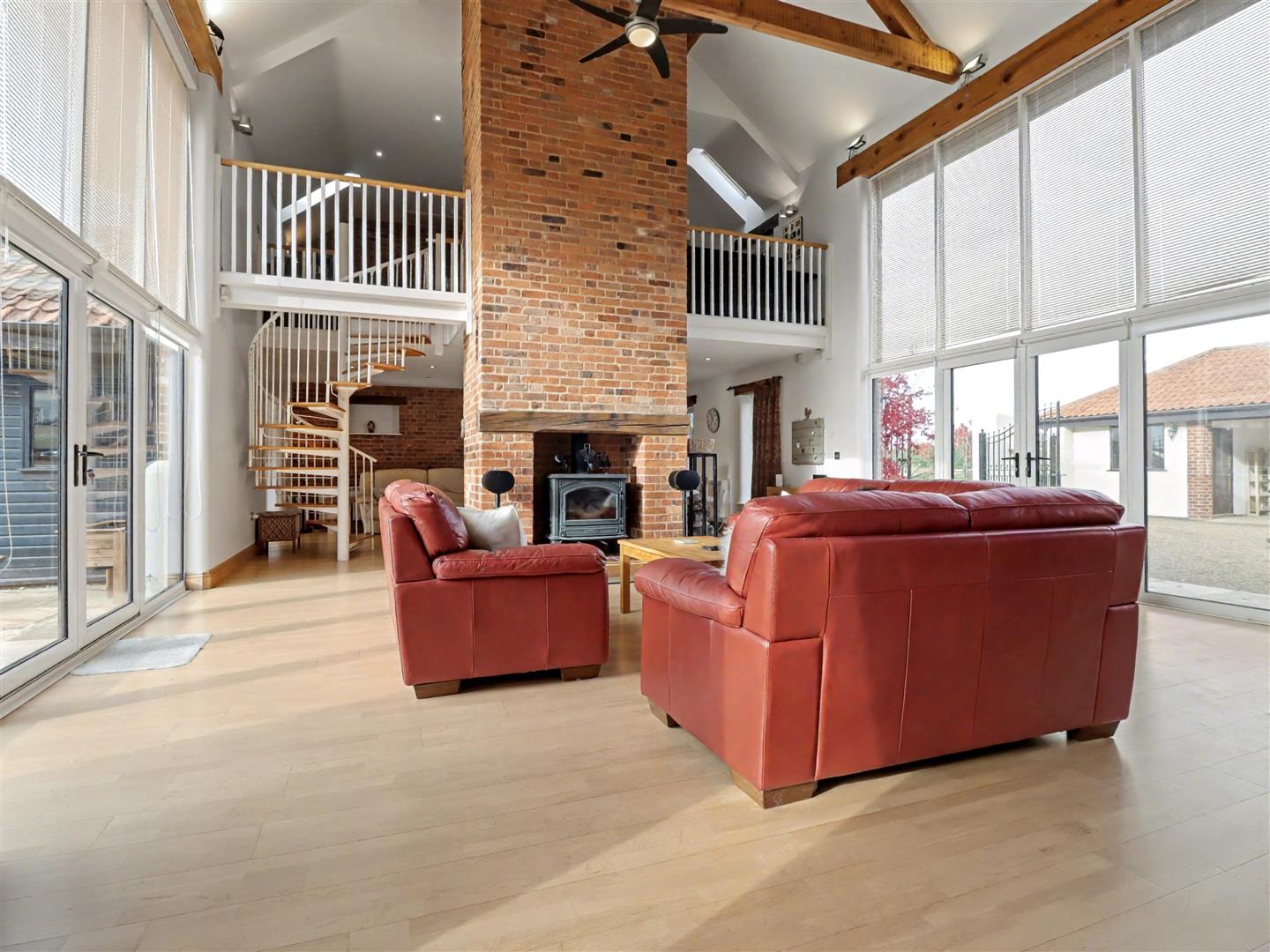 Drawing/Sitting Room - 15.54m x 6.35m inc above (51'0 x 20'10 inc above) - Full-height sealed unit double-glazed windows with double opening doors lead out to the rear garden, mirrored on the opposite side to create a beautifully balanced and light-filled space. This stunning room is vaulted upwards into a magnificent display of exposed beamed roof framework. The central staircase rises to the galleried landing, where the exposed chimney breast and working wood burner form a striking focal point. The matching flooring continues throughout, with a door leading through to the inner hall.
