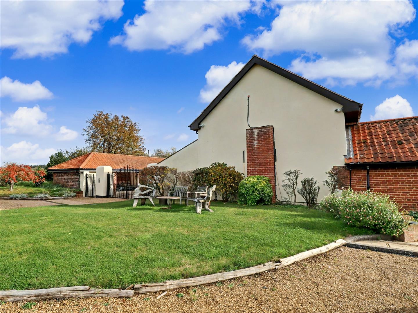 Outside - Set within a beautifully landscaped plot of approximately 1 acre (stms), this home has been thoughtfully designed to blend functionality with charm. A short shared driveway leads to an impressive entrance, with a gravelled drive extending to front parking and a gated annexe courtyard. To the left, a small orchard flows into the front garden, mainly laid to lawn, while a productive kitchen garden adds a delightful countryside touch to the property.