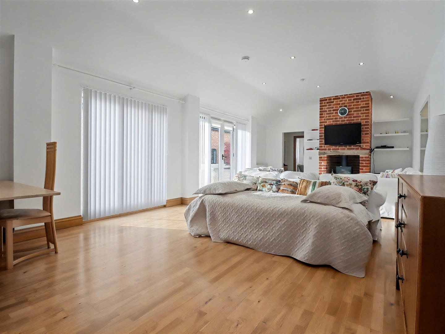 Annexe Sitting Room - 8.51m x 4.37m (27'11 x 14'4) - This fantastic space is perfect for multi-generational living or as a potential holiday let. Wood-framed double-glazed double entrance doors, complemented by windows, welcome natural light into the room. A striking full-height exposed brick fireplace with an inset wood burner serves as a central feature, while a door leads to the garden room. Another door opens to a lobby, providing access to the annexe bedroom and bathroom, creating a self-contained and versatile living area.