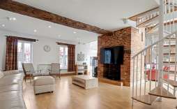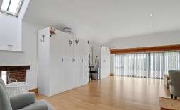 Family Room - The family room, leading directly from the kitchen/breakfast/dining room, is a fantastic bright and spacious family area that still manages to feel wonderfully cosy. Sealed unit double-glazed windows to the side allow natural light to pour in, while a central feature fireplace, areas of exposed brickwork, and wood-style flooring add warmth and character. A spiral staircase rises to the mezzanine study/library, enhanced by a ceiling beam and vaulted opening through to the sitting/drawing room, creating an impressive sense of height and flow.