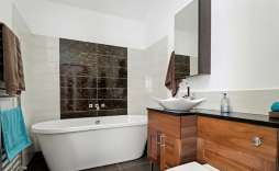 Annexe Bedroom and Bathroom - 5.11m x 4.29m (16'9 x 14'1) - Wood-framed, sealed unit double-glazed double doors open out to the courtyard, with a separate door leading to the boiler cupboard. The bathroom features a double-ended bath with wall-mounted taps and tiled splashbacks, a concealed-cistern WC, and a vanity wash hand basin, combining style and practicality.