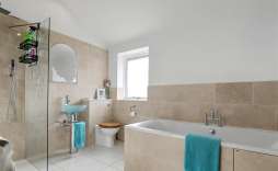 Ensuite Bathroom - A sealed unit double-glazed window to the side brightens the room, which features a shower cubicle, panel bath, WC, and wash hand basin. Travertine splashbacks and a tiled floor add a stylish and durable finish.