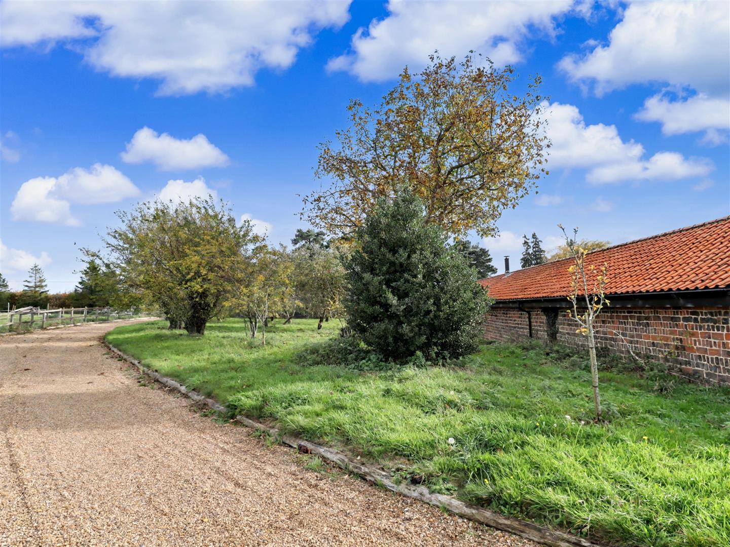 Approached via its own private driveway, the property welcomes you with a charming small orchard, creating a beautiful first impression.