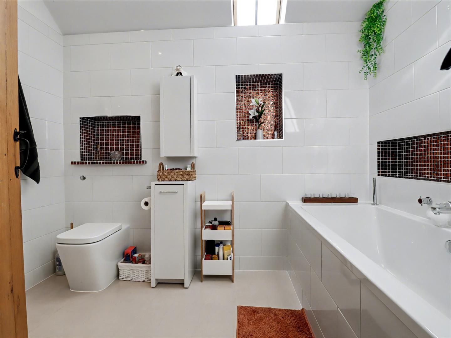 Bathroom - This family bathroom is bright and inviting, with a Velux roof window flooding the space with natural light. It features a panel bath, WC, and distinctive wash hand basin, combining practicality with a clean, contemporary design that makes it both functional and welcoming for everyday family use.