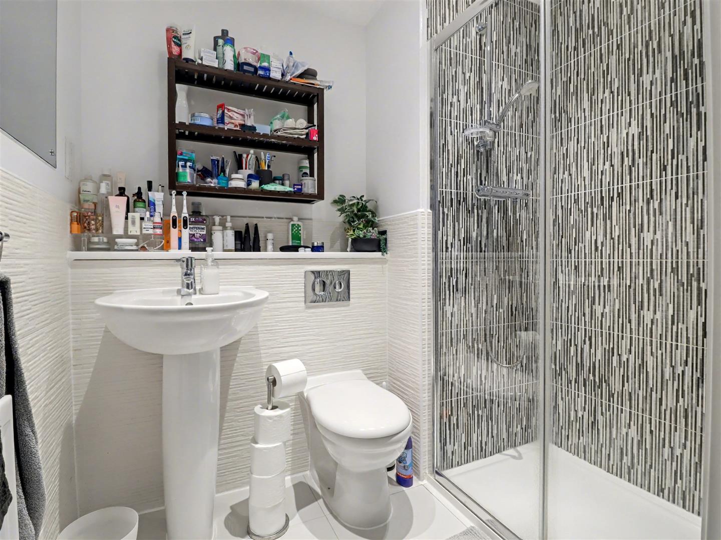 Ensuite - shower cubicle. wash hand basin and wc, splashbacks and radiator.