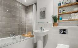 Family bathroom - Panel bath with screen and shower over, pedestal wash hand basin and wc. Tiled splashbacks and radiator.