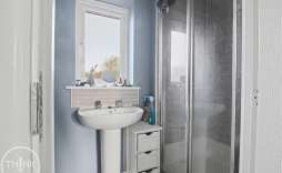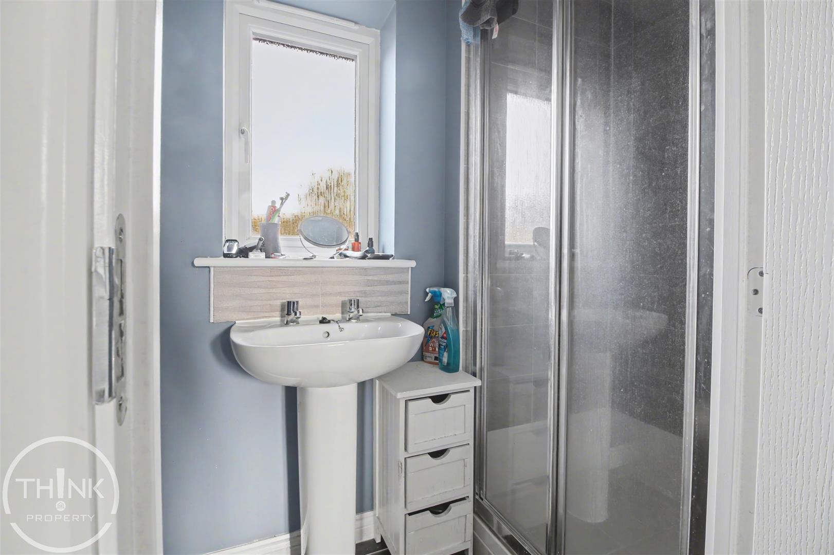 En Suite - Tiled flooring, shower cubicle, pedestal wash basin, low level W/C, obscured double glazed window to rear, radiator.
