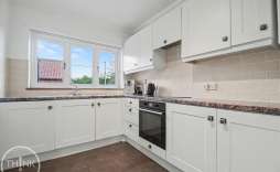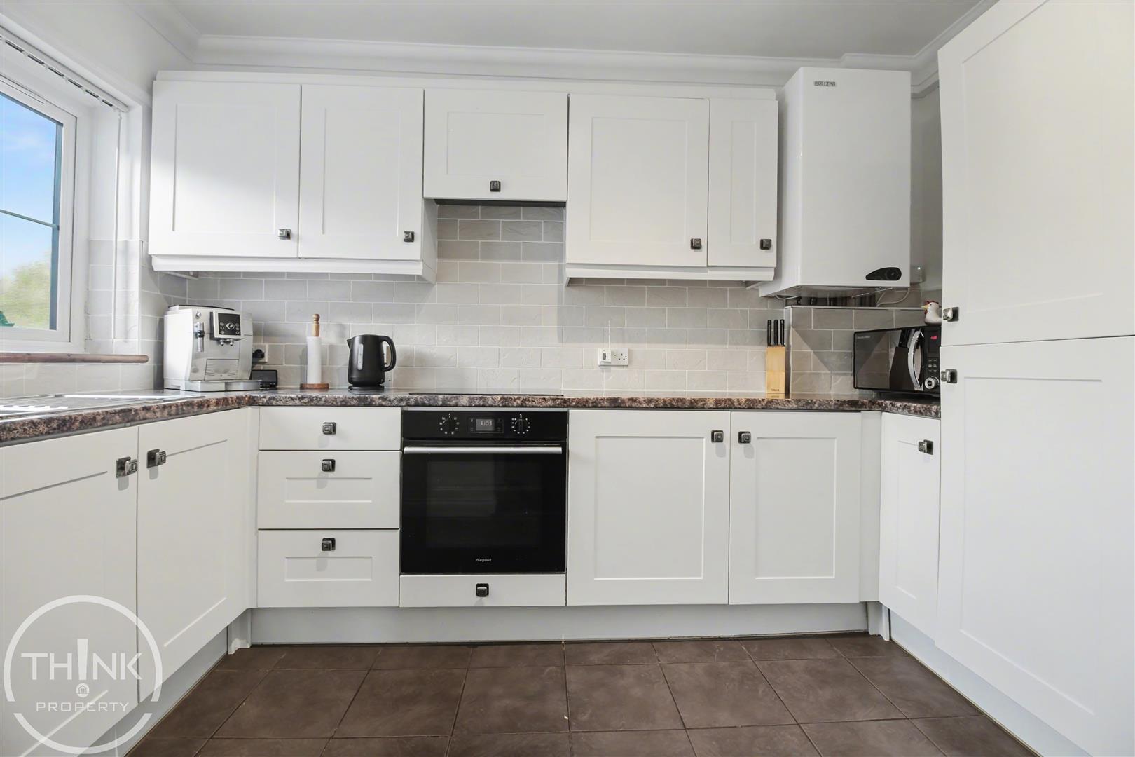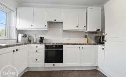 Kitchen - 3.57 x 2.36 (11'8" x 7'8") - Tiled flooring, range of fitted base and wall units with rolled edge work surfaces over, integrated oven, hob and hood, integrated fridge/freezer, integrated washing machine, tiled splash backs, double glazed window to front, opening to rear lobby.