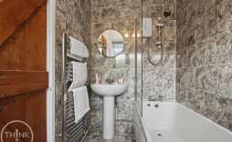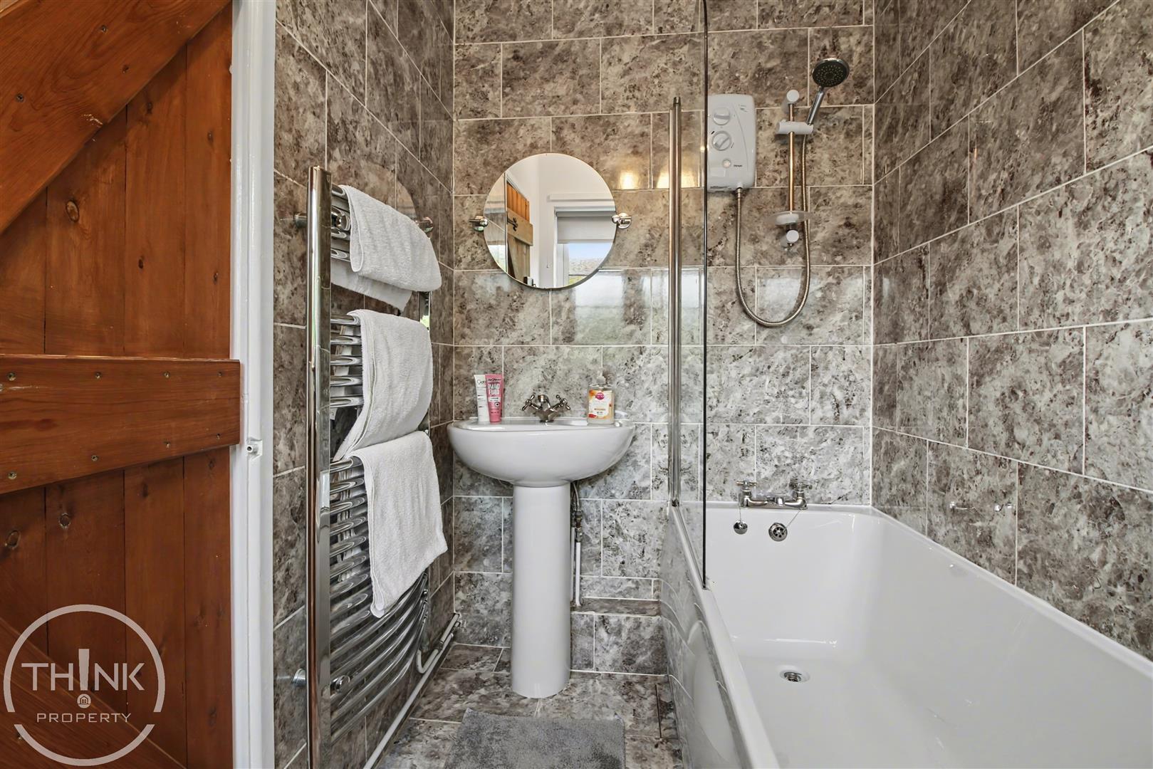 Bathroom - 2.42 x 1.49 (7'11" x 4'10") - Porcelain tiled floor and walls, low level W/C, pedestal wash basin, panelled bath with electric shower, obscured double glazed window to rear, heated towel rail.