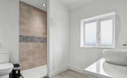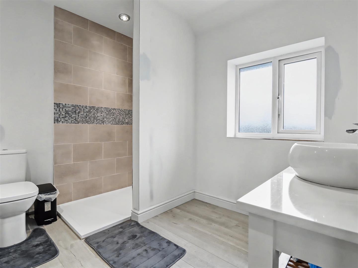 Ensuite - Spacious ensuite offering vanity wash hand basin, wc and walk in double shower with tiled back splash. Inset spot lights. Sealed unit double glazed window to the front.